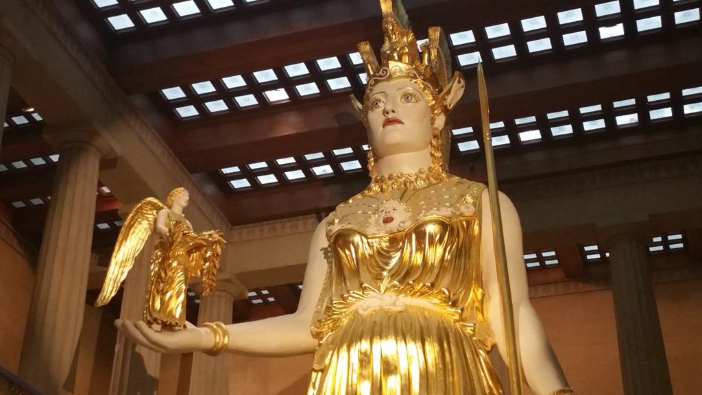 Pero el Partenón no estaría completo sin la gran estatua crisoelefantina realizada por Fidias para el interior. La verdadera Atenea Parthenos de marfil y oro se perdió hace siglos, el oro mucho antes, pues era el tesoro, la reserva del banco central de Atenas. En 1990 el escultor de Nashville, Alan LeQuire, realizó una réplica de la Atenea Parthenos de Fidias de más de 13 metros, para hacerla partió de las copias en mármol que existen de ella.