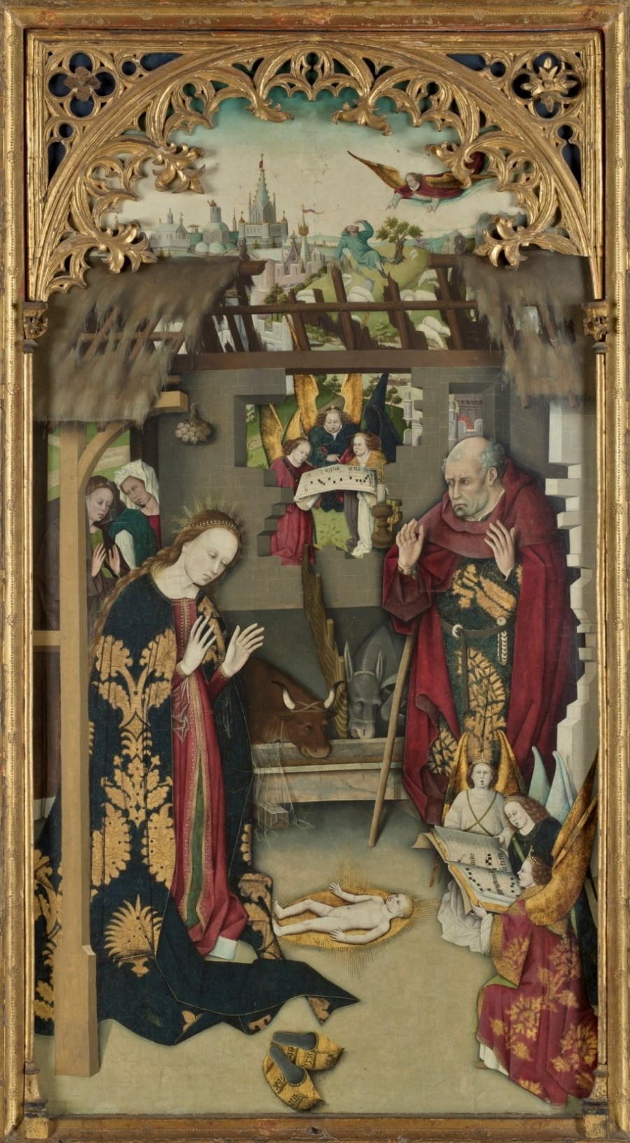 A medida que avanza el naturalismo a finales del siglo XIV, las ruinas desaparecen, tenemos un establo, pesebre o cobertizo, también desaparece la cueva, pero se sigue manteniendo la escena nocturna. El Niño es el foco de luz de la escena pues la luz emana de él.