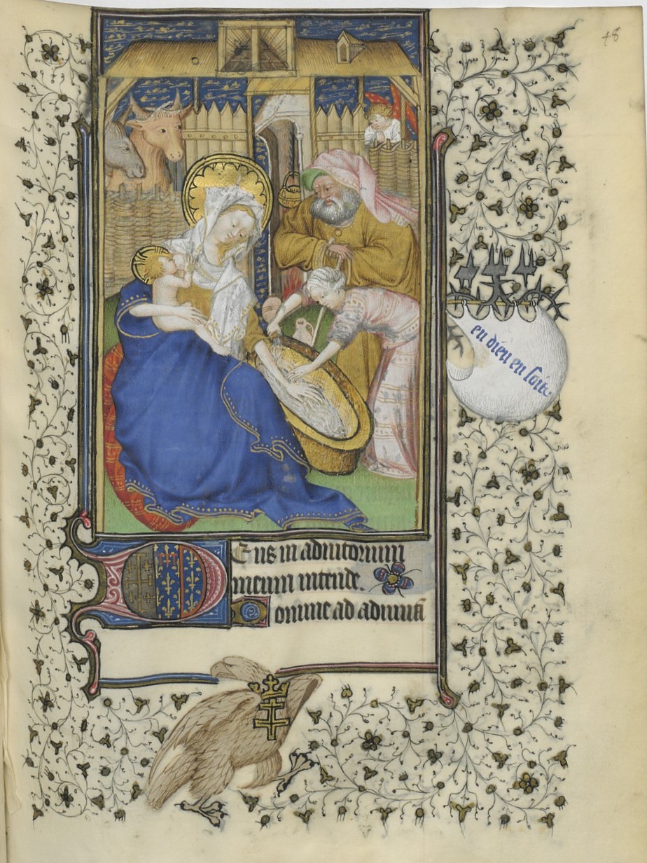 Hemos llegado ya al final de las clases del primer trimestre, incluso yo al que mi ojo ha retirado un tiempo del trabajo, y queda muy poco tiempo para Navidad. Para esta entrada me gusta elegir una imagen de la Natividad de época medieval en la que hay detalles en su iconografía que se perdieron después en el renacimiento y el barroco, y para esos pequeños detalles no hay nada como los códices miniados y sobre todo, los libros de horas del gótico internacional.